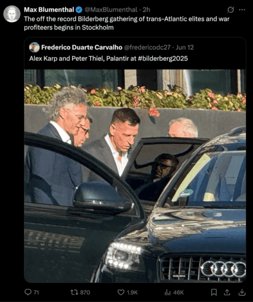 Henry Makow - Jun 16th 2025 1:17pm EDT Please send links and comments to [email protected] Peter Thiel has attended every Bilderberg conference since 2007. Karp since 2022. They are big Trump financial backers. They are creating a Chinese-style social credit system for the US. At the conference in Stockholm, they rub shoulders with such woke Commie proxies as Stacey Abrams and Christia Freeland. There is […]