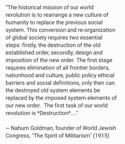 (Left, Quote from World Jewish Congress Founder Nahum Goldman 1895-1982- Forgive me for posting this again but people these days have short attention spans and even shorter memories.) We can’t defend ourselves if we can’t even name the enemy. We face an occult force. Organized Jewry and its minion Freemasonry, are dedicated to destroying civilization. […]