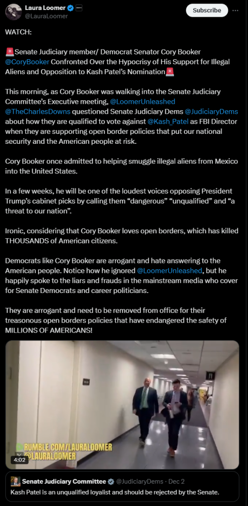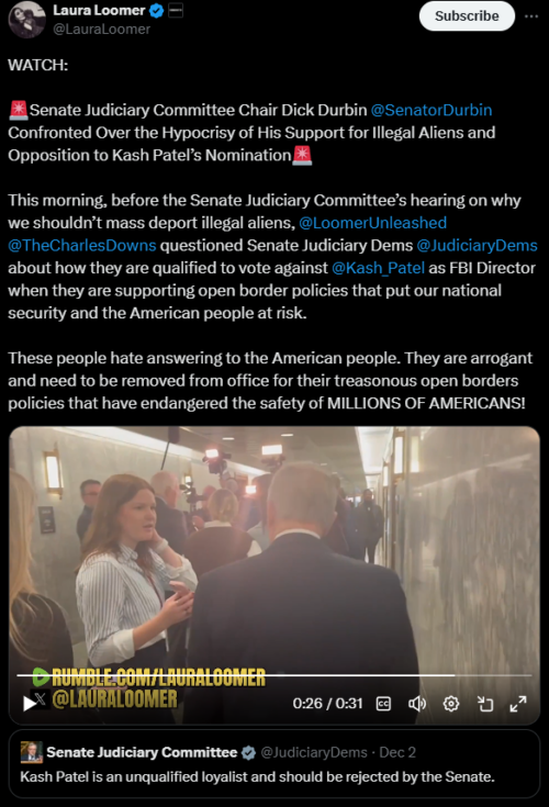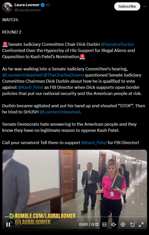 The Senate Democrats have been ranting to the American people about Kash Patel’s lack of “qualifications” to serve as FBI Director. Some of the loudest voices amongst the Senate Democrats on this subject come from the Senate Judiciary Democrats. As he walked into the Senate Democrats Judiciary Executive Committee Meeting on Thursday, Loomer Unleashed confronted […]
