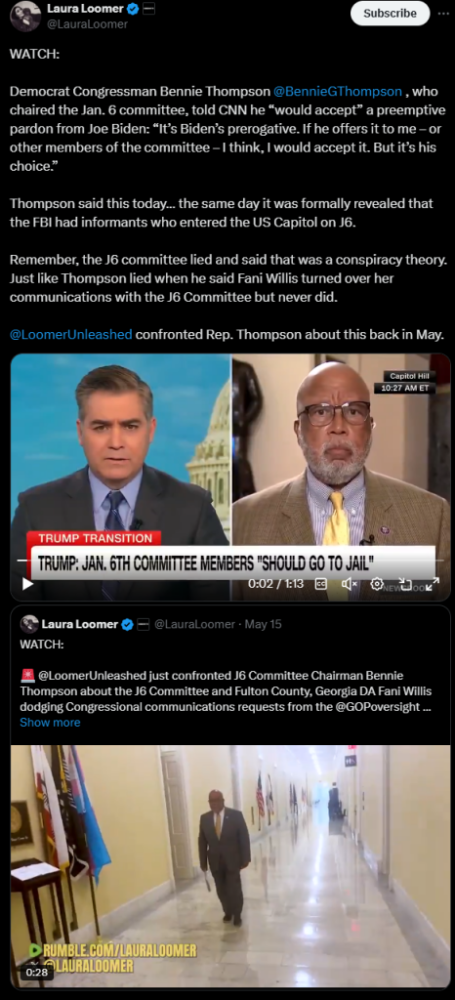 On Thursday, January 6th Committee Chair Bennie Thompson stated he would accept a pardon from Joe Biden if it were offered to him. Thompson made these comments the same day it was formally revealed that the FBI had informants who entered the US Capitol on J6. In May, Thompson falsely told Loomer Unleashed that the […]
