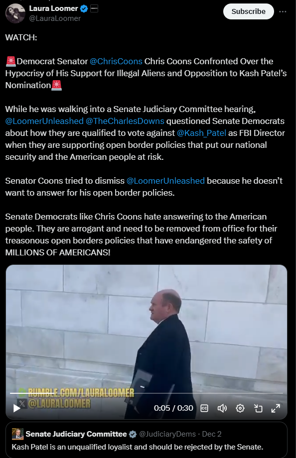 The Senate Democrats have been ranting to the American people about Kash Patel’s lack of “qualifications” to serve as FBI Director. Some of the loudest voices amongst the Senate Democrats on this subject come from the Senate Judiciary Democrats. As he walked into the Senate Democrats Judiciary Executive Committee Meeting, Loomer Unleashed confronted Delaware Democrat Senator Chris […]