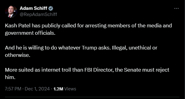 “Ethics” seems to be one of the new buzzwords elected Democrats are using to attempt to destroy President Trump’s cabinet nominees. Following President Trump’s nomination of Kash Patel as FBI Director, Incoming California United States Senator Adam Schiff took to X to lecture America about Trump and Patel’s “ethics.” It is hypocritical for Schiff to […]