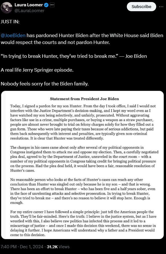 On Sunday evening, Joe Biden announced that he would be pardoning his son Hunter, who will no longer have to worry about facing accountability for the gun and tax evasion charges. In his statement announcing Hunter’s pardon, Joe Biden blamed the House GOP for the charges Hunter was facing. Hunter Biden was convicted for lying […]