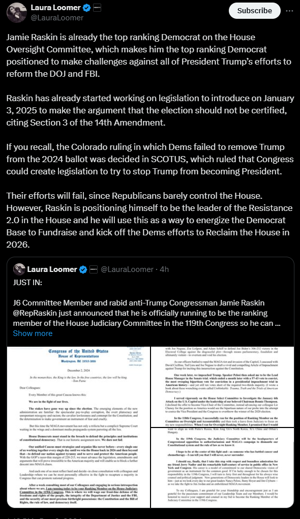 Incoming California United States Senator Adam Schiff and powerful House Rep. Jamie Raskin, who are leaders of the left’s “Get Trump” policies in Congress, spent their weekend pledging to “fight” for the American people and “defend” the Constitution. Schiff and Raskin sat on the January 6th Committee. Rep. Raskin called Loomer Unleashed “delusional” after we […]