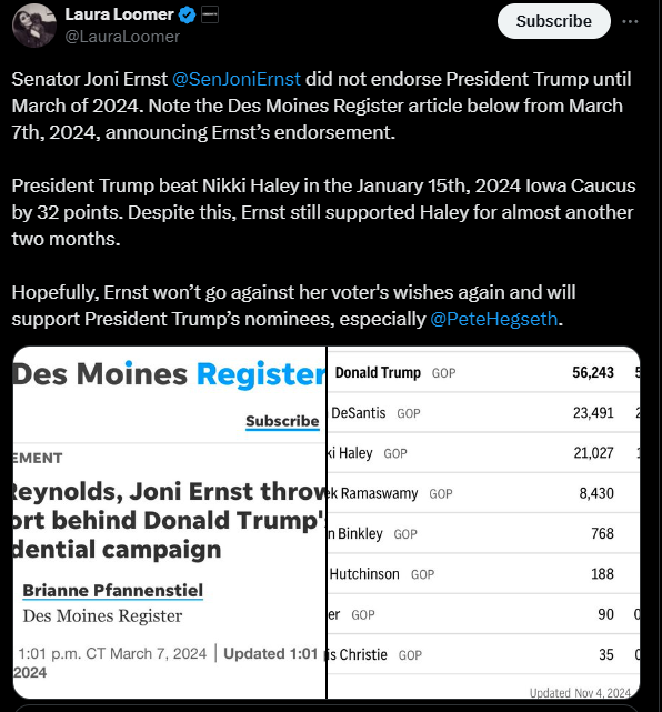 Iowa United States Senator Joni Ernst said that “the vetting will continue” after being asked if she would support President Trump’s Secretary of Defense Nominee Pete Hegseth. Ernst sits on the Senate Armed Services Committee. It is important to note that Ernst voted to confirm Joe Biden and Kamala Harris’s Secretary of Defense, Lloyd Austin, […]