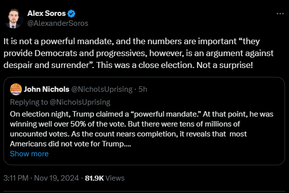 Alex Soros recently posted to X that Trump’s victory was a “close election,” and thus, Trump does not have a mandate to implement his policies. Like clockwork, The New York Times and Politico ran headlines following Soros X’s post that repeated Soros’s lie that President Trump did not win November’s election by a large margin […]