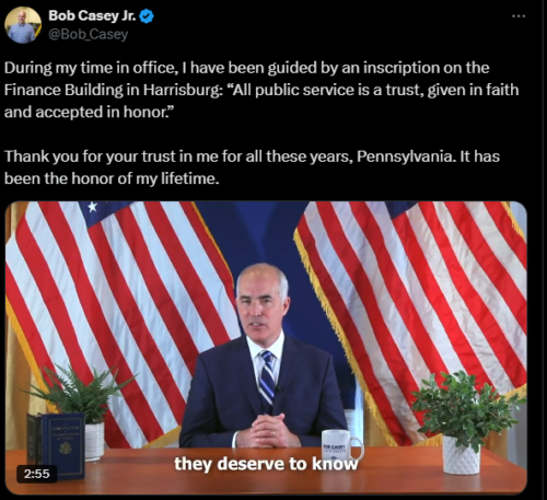 Outgoing Pennsylvania United States Senator Bob Casey finally conceded on Thursday night. Casey’s concession came weeks after his race was called. Casey’s efforts to overturn his election loss became so serious that he was fundraising for his post-election challenges as Pennsylvania Senate Elect David McCormick attended new senator orientation on Capitol Hill. Top Democrat election […]