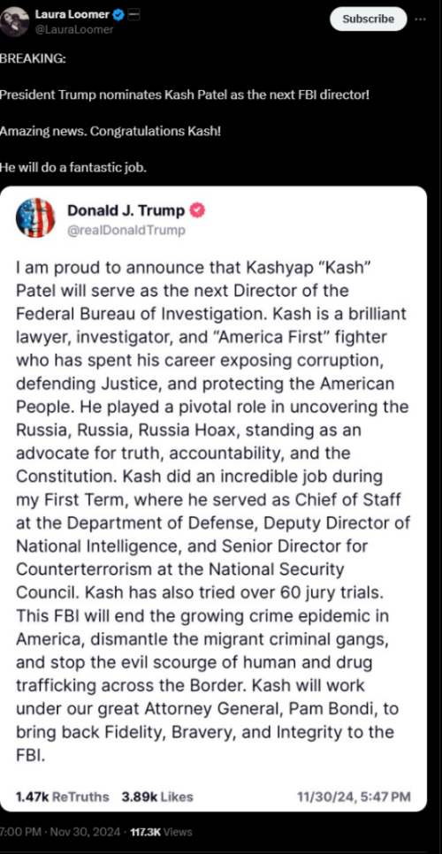 President Trump announced via TruthSocial on Saturday night that he is nominating Kash Patel as FBI Director. On the campaign trail, Trump promised to clean up the FBI’s corruption. Trump’s nomination of Patel is yet another promise Trump is fulfilling to voters, as Patel has pledged numerous times to end the FBI’s political weaponization. The […]
