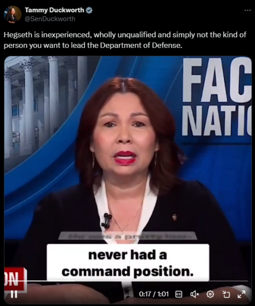 Illinois Senator Tammy Duckworth attacked President Trump’s Secretary of Defense Nominee, Pete Hegseth, on X and during mainstream media appearances, calling Hegseth “Unqualified and Dangerous.” It is interesting that Senator Duckworth wants to attack Hegseth using the words “unqualified and dangerous” when Senator Duckworth sponsored a bill that supports illegal immigrants joining the United States […]