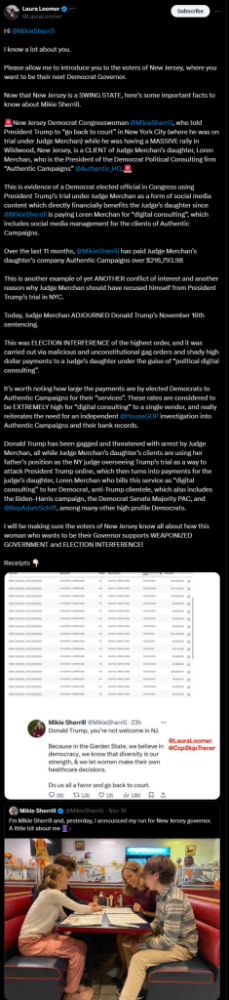 Another client of Judge Merchan’s daughter’s firm, Authentic Campaigns, seems to be in line for a promotion. United States House Rep. Mikie Sherrill announced she is running for Governor of New Jersey. Sherrill will be the favorite to win the Democrat Primary and advance to the general election in 2025. Authentic Campaigns offers services that […]
