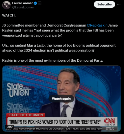 Following President Trump’s nomination of Kash Patel as FBI Director, J6 Committee Member Jamie Raskin informed CNN viewers that he had seen no proof that the FBI is politically weaponized. It is interesting that Raskin would make such remarks, considering that the J6 Committee provided “materials” to Jack Smith, which he used to indict President […]