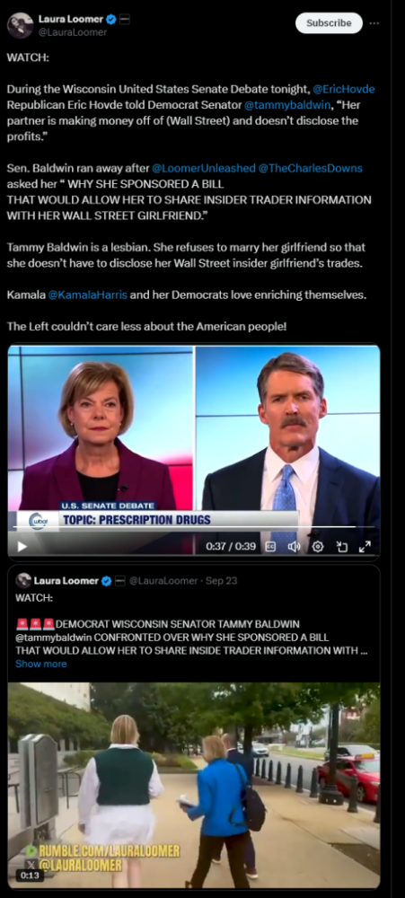 Wisconsin Senator Tammy Baldwin was exposed by her opponent, Eric Hovde, during Friday’s Wisconsin United States Senate Debate for refusing to disclose her Wall Street girlfriend’s stock trades and assets. Senator Baldwin refused to answer Loomer Unleashed’s question about why she sponsored legislation allowing her to share insider stock information with her Wall Street girlfriend. […]