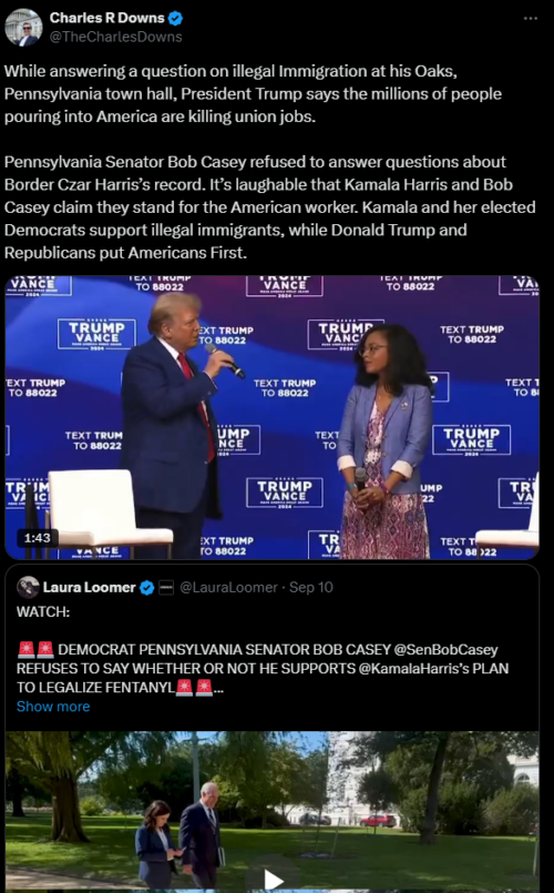 President Trump continues to draw a sharp contrast between his policies of a secure border and Kamala Harris’s policies of open borders. While speaking at a town hall in Oaks, Pennsylvania, on Tuesday night, Trump highlighted the economic costs Kamala Harris’s open borders are having on Americans. Trump pointed out that Kamala’s open borders affect […]