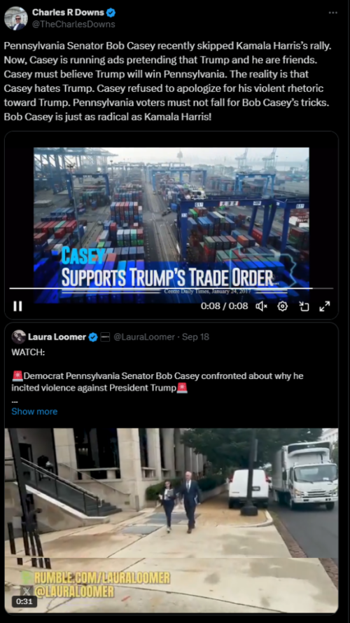 Kamala Harris’s Pennsylvania poll numbers collapse is causing a down-ballot ripple effect in the Key Stone State. Pennsylvania Senator Bob Casey, who faces reelection, is now running ads that attempt to portray him as supporting Trump’s policies. Casey also skipped Kamala Harris’s recent Pennsylvania rally. Kamala informed her Pennsylvania crowd that Casey was not in […]