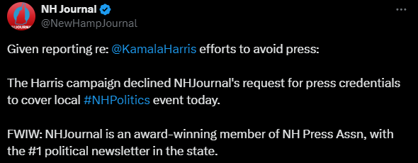 The Kamala Harris astroturf show made a stop in New Hampshire on Wednesday. Harris’s speech to the Granite State was complete with a bused in crowd, policy lies, a pledge to raise taxes, and no press conference with the media. Before Harris’s event even began, the NH Journal announced that the Harris campaign denied their […]