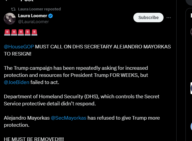 Laura Loomer - Jul 14th 2024 5:02am EDT Calls intensified Saturday for the House GOP to subpoena DHS Secretary Alejandro Mayorkas And U.S. Secret Service Director Kimberly Cheatle in the wake of the failed assassination plot against President Trump. This was after information revealed the shooter was able to climb a ladder on a building around 150 yards from the rally and fire […]