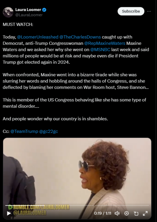 Laura Loomer - Jul 14th 2024 1:24am EDT Loomer Unleashed repeatedly warned California Representative Maxine Waters that her recent unhinged and untrue comments about President Trump and his supporters would have disastrous effects. In May, Rep. Waters stated without any facts that “Trump supporters were training in the hills waiting to attack our democracy.” In June, Rep. Waters said, “Trump’s reelection could kill […]