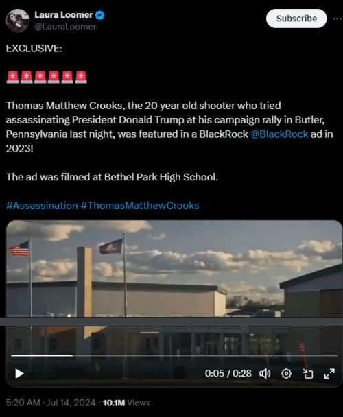 Laura Loomer - Jul 14th 2024 8:55pm EDT Thomas Matthew Crooks, the 20-year-old shooter who attempted to assassinate President Trump at his campaign rally in Butler, Pennsylvania, on Saturday, was featured in a BlackRock AD that aired in 2023. The company has since removed the video. BlackRock is an investment firm leading the charge of implementing DEI into America’s economy. Unsurprisingly, BlackRock despises […]