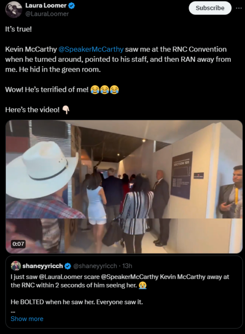 Laura Loomer - Jul 16th 2024 10:04am EDT Former Speaker Kevin McCarthy earned his nickname “Little Kevin” at the RNC Convention on Monday as he pointed and then ran away from Laura Loomer before she even had a chance to ask him a question. Rumors are flying that McCarthy is attempting to become President Trump’s Chief of Staff. McCarthy cowardly sprinting away from […]