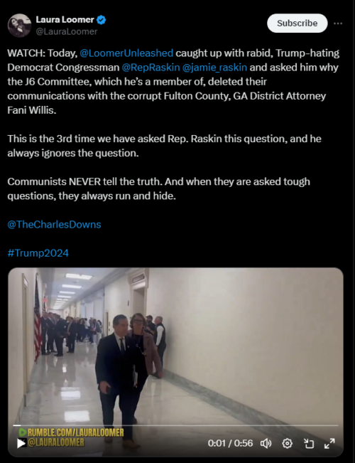 January 6th Committee Member Jamie Raskin ran scared when we asked him Tuesday about his deleted communications with Fulton County DA Fani Willis. Fani Willis recently ran away from Loomer after Loomer asked her why she was not complying with the House Judiciary request for her communications with the J6 Committee. Tuesday was not the […]