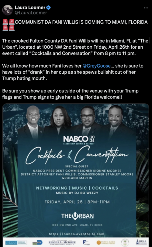 Fulton County DA Fani Willis spent her Friday evening on a taxpayer-funded trip networking with top Biden Bundler Kneeland Youngblood at the National Association of Black County Officials event in Miami, Florida. Interestingly, in January of 2023, Youngblood was appointed by Joe Biden to serve on the “POTUS’s Intelligence Advisory Board.”An exclusive live stream from Loomer Unleashed shows that […]