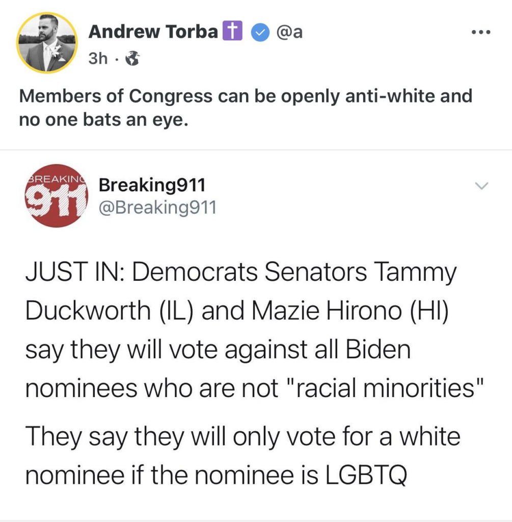 Laura Loomer - Mar 24th 2021 7:14am EDT Anti-white discrimination and hatred is on full display in the U.S. Senate! Democrat Senators Tammy Duckworth (IL) and Mazie Hirono (HI) said they will vote against all Biden nominees who are not “racial minorities, and that they will only vote for a white nominee if the nominee is LGBTQ. Illinois Democrat Senator Tammy Duckworth said […]