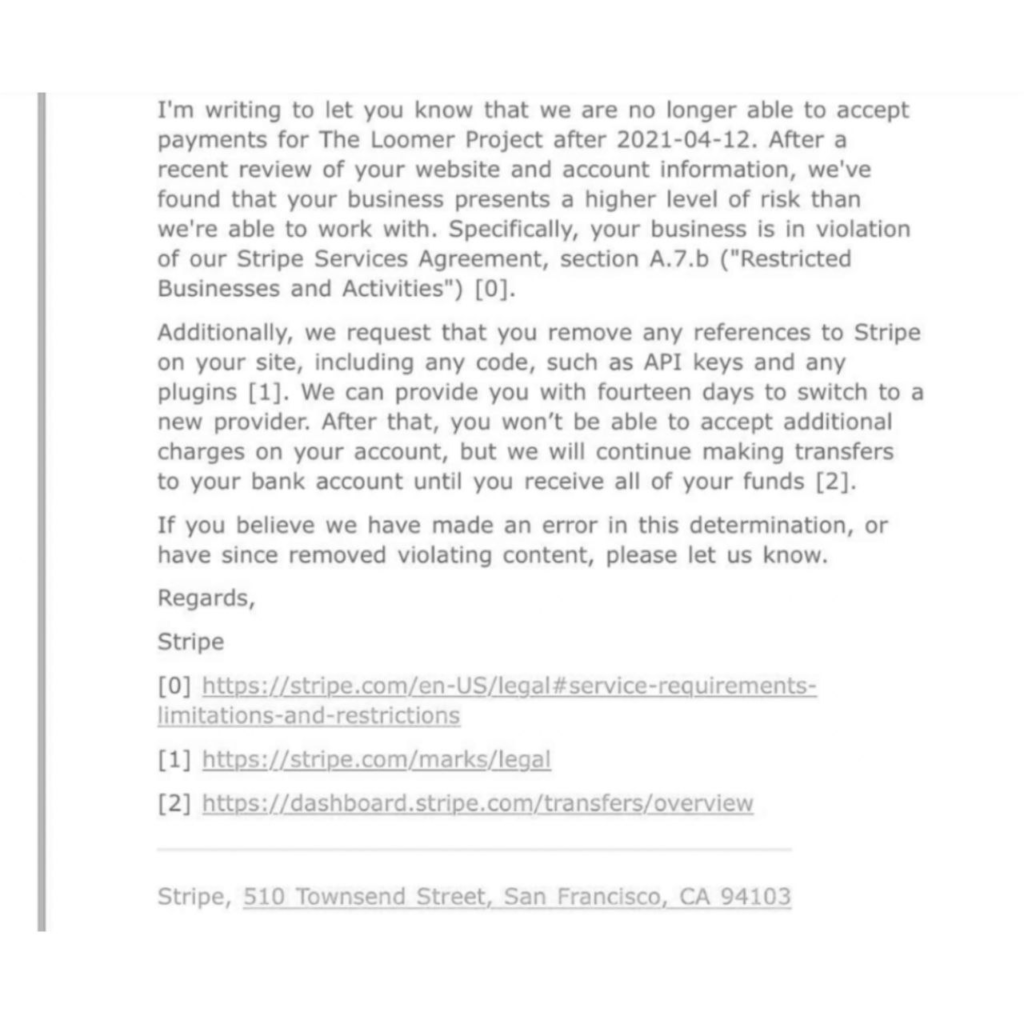 Laura Loomer - Mar 30th 2021 6:10am EDT Florida Congressional candidate and outspoken conservative activist Laura Loomer received notice last night via email that the payment processing company Stripe would no longer accept payments for The Loomer Project. “I’m writing to let you know that we are no longer able to accept payments for The Loomer Project after 2021-04-12. After a recent review […]