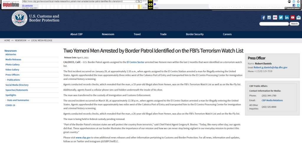 Laura Loomer - Apr 8th 2021 7:16am EDT After Customs and Border Patrol announced on Monday that they had apprehended two Yemini men at the US southern border as being on both the FBI’s Terrorism Watch List as well as the No-Fly List, CBP issued a press release, but then quickly deleted it. SOURCE: Wayback Machine SOURCE: Wayback Machine The press release lays […]