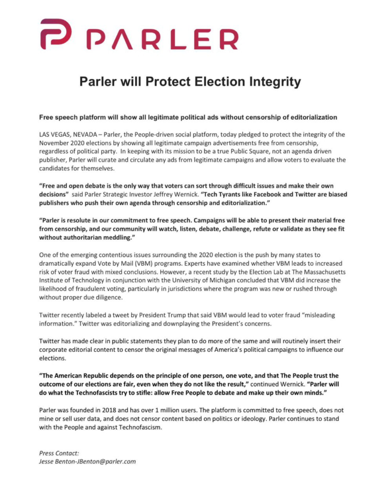 Free Speech Social Media Platform Parler Declares To Show All Political Ads ‘Without Censorship of Editorialization’