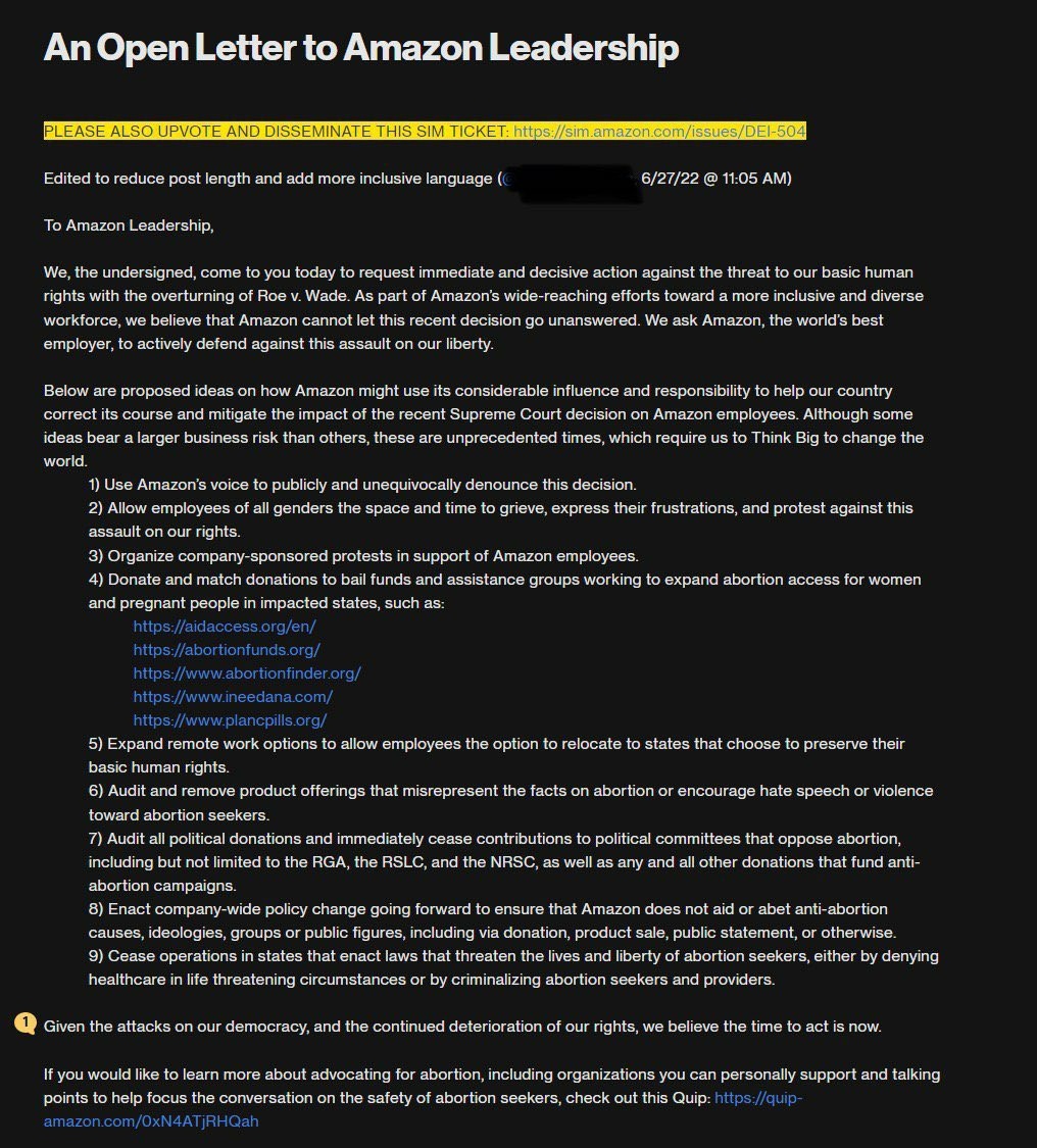 Libs of Tik Tok on Gab: ‘SCOOP: Hundreds of Amazon employees signed an open letter to Amazon leadership demanding they cease doing business in states where abortion is illegal and requesting time off to grieve the Supreme Court ruling’