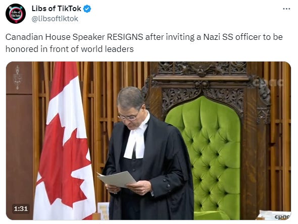 Libs of TikTok - Sep 27th 2023 8:01am EDT It’s hard to believe this actually happened. In case you missed it, Anthony Rota, the Speaker of Canada’s House of Commons resigned Tuesday afternoon. Why? Oh, you know, for publicly recognizing and praising a Nazi who fought in a Nazi division during World War II. Yes, an actual Nazi, by the name of Yaroslav Hunka. […]