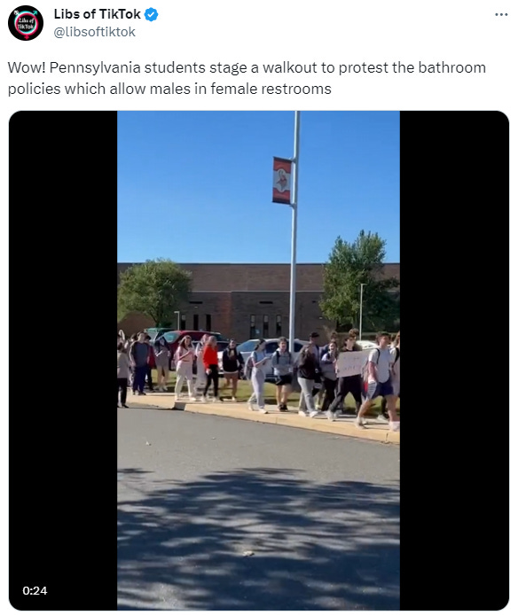 Libs of TikTok - Sep 22nd 2023 8:00am EDT If you need a spiritual boost today, watch the video below. Hundreds of students from Pennsylvania’s Perkiomen Valley School District walked out of the school together to protest bathroom rules allowing males in female restrooms and vice versa. The protest was organized by a student by the name of John Ott, as was reported by […]