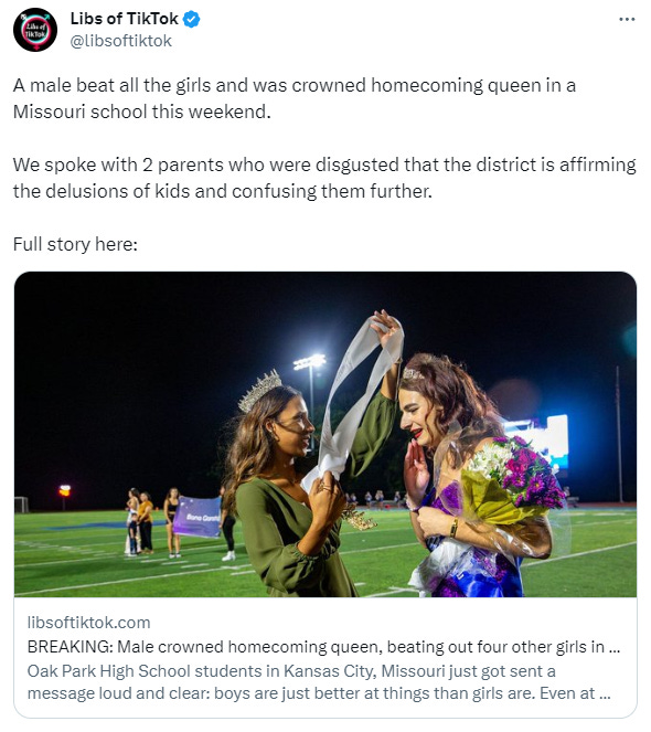 Libs of TikTok - Sep 18th 2023 5:25pm EDTA male beat all the girls and was crowned homecoming queen in a Missouri school this weekend. We spoke with 2 parents who were disgusted that the district is affirming the delusions of kids and confusing them further. Full story here:https://t.co/g2YqPlfjAt — Libs of TikTok (@libsoftiktok) September 18, 2023