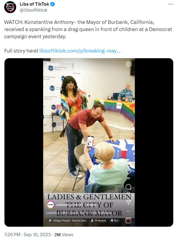 Libs of TikTok - Sep 10th 2023 7:26pm EDTWATCH: Konstantine Anthony- the Mayor of Burbank, California, received a spanking from a drag queen in front of children at a Democrat campaign event yesterday. Full story here! https://t.co/G6BudDFuGs pic.twitter.com/Dxb5bJ9Cuw — Libs of TikTok (@libsoftiktok) September 10, 2023
