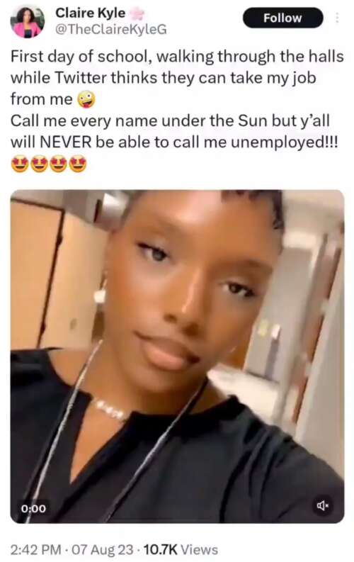 Libs of TikTok - Aug 8th 2023 6:08pm EDT“Black supremacist” teacher with history of shocking anti-white racist tweets is fired after bragging that she wouldn’t get fired Full story here!https://t.co/rxE9AxHHIi — Libs of TikTok (@libsoftiktok) August 8, 2023