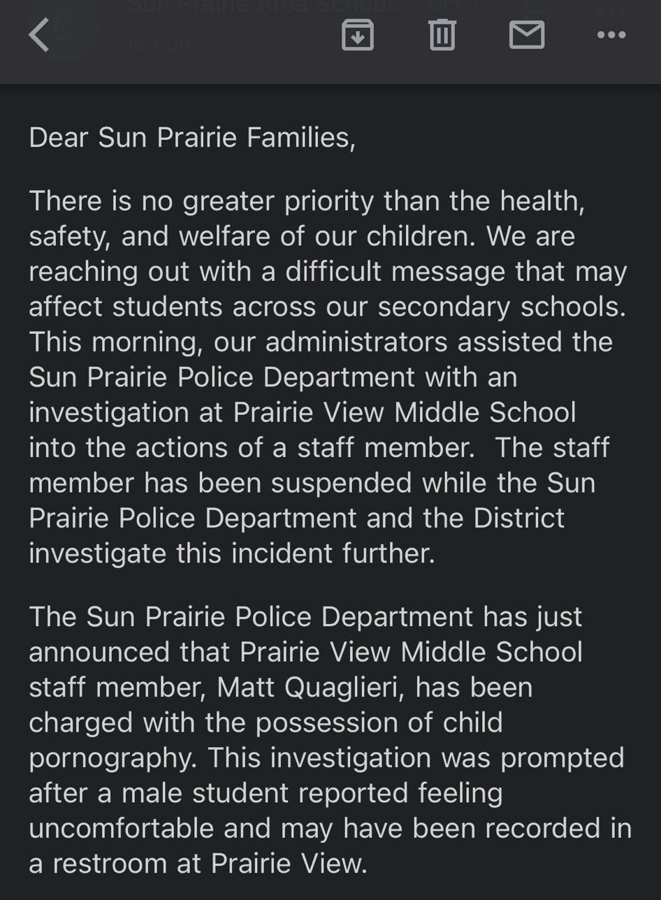 Libs of Tik Tok on Gab: ‘A middle school teacher at Sun Prairie Schools in WI was arrested for possession of child pornography after he allegedly filmed students in the bathroom.’