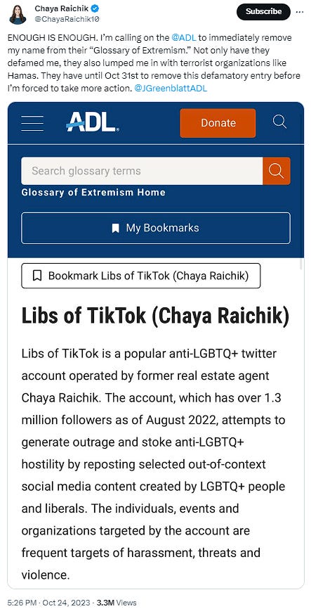 Libs of TikTok - Nov 5th 2023 6:38pm EST On October 24th, 2023, Libs of TikTok founder Chaya Raichik called out the ADL and gave them 1 week to remove her from their ‘Glossary of Extremism.’ Libs of TikTok/Chaya were put there in 2022. This list is supposedly dedicated to tracking “extremist” organizations such as Al-Qaeda and Hamas. Chaya took to X(Twitter) to demand […]