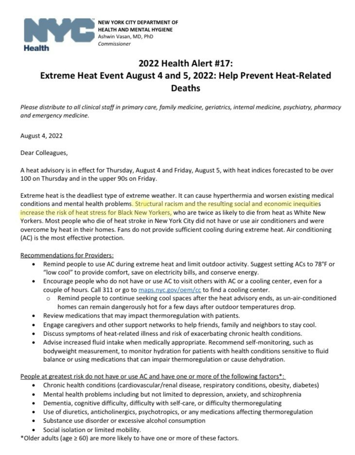 Libs of Tik Tok on Gab: ‘NYC Dept of Health & Mental Hygiene warned today that “structural racism increases the risk of heat stress for black New Yorkers.” Our health experts..’