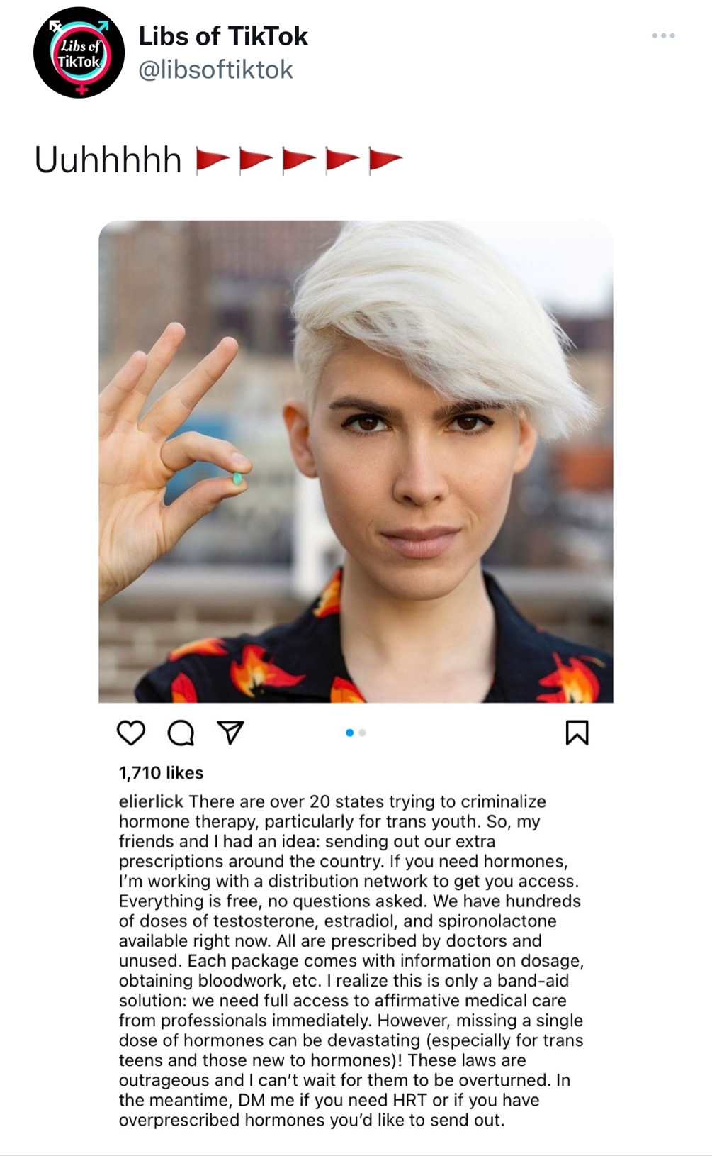 Libs of Tik Tok on Gab: ‘I’ve uncovered more evidence of Eli Erlick’s drug trafficking scheme. It appears it’s been going on since at least September, 2021. Here’s Eli encouraging her followers to distribute drugs to others’