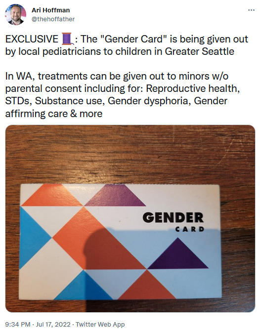 Libs of Tik Tok on Gab: ‘Seattle Children’s hospital partnered with an organization to hand out “gender cards” which asks kids about their gender identity, sexual preferences, pronouns, and which information the doctor can share with the child’s parents/guardians.’