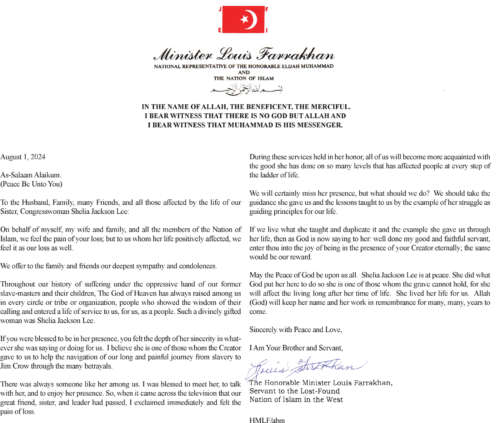 Nation Of Islam - May 21st 2024 10:53am EDT May 21, 2024 As Salaam Alaikum. Dear Excellency, Ayatullah Seyyed Ali Hosseini Khamenei, Supreme Leader of the Islamic Revolution and the People of Iran, “Surely we are Allah’s and to Him we shall return.”- Holy Qur’an, 2:156 I, on behalf of the Shura Executive Council, my family and the entire Nation of Islam extend our […]