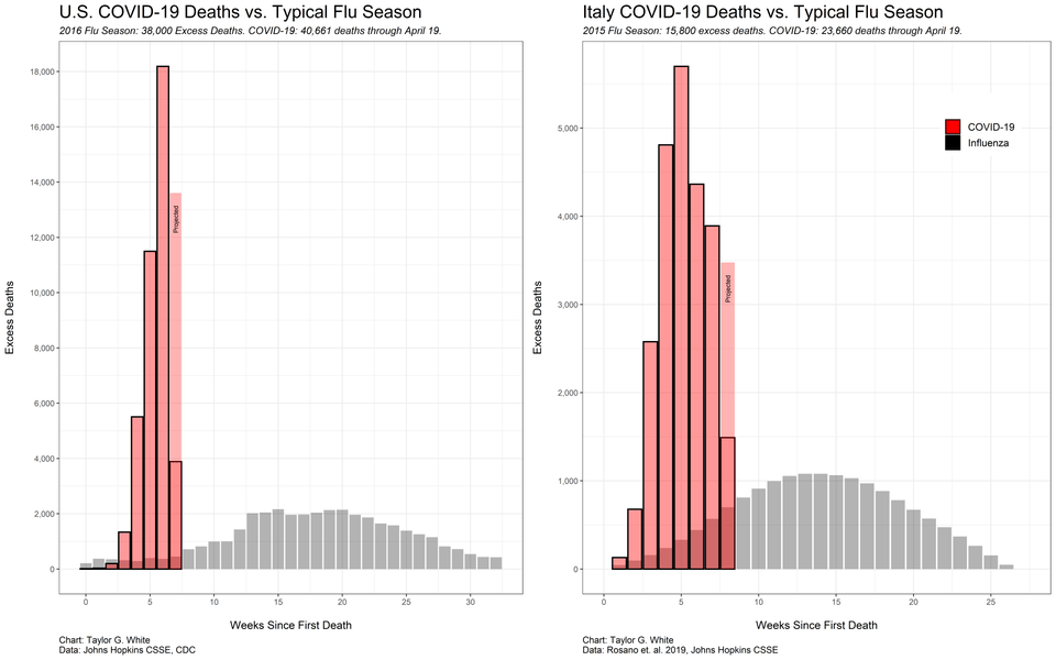 COVID-19 Deaths vs. Typical Flu Seasons in the U.S. and Italy