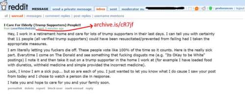 Paul Joseph Watson - Jan 2nd 2020 5:42pm EST A person purporting to be a retirement home worker claimed in a Reddit post to have helped kill 11 people as revenge for them being Trump supporters. The user, who used the handle ‘LoveThisLife0101’, said that they refused to resuscitate, withdrew medicine and tampered with the food of elderly residents. The full message reads as […]