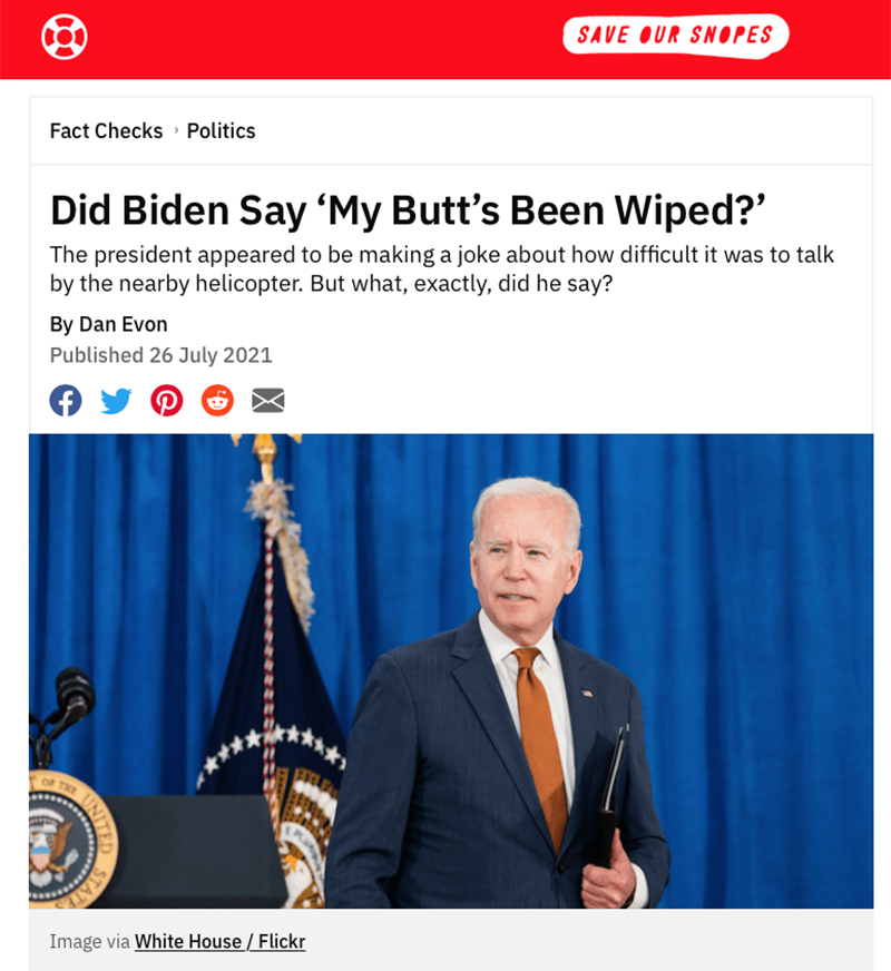 Following the bizarre gibbering nonsense that came out of Joe Biden’s reanimated mouth Sunday, debunking site Snopes has allocated its resources to investigating and concluding that the so called President of the United States probably did not yell “my butt’s been wiped” at a reporter. Full interview of @POTUS “my butt has been wiped” comment.Why, […]