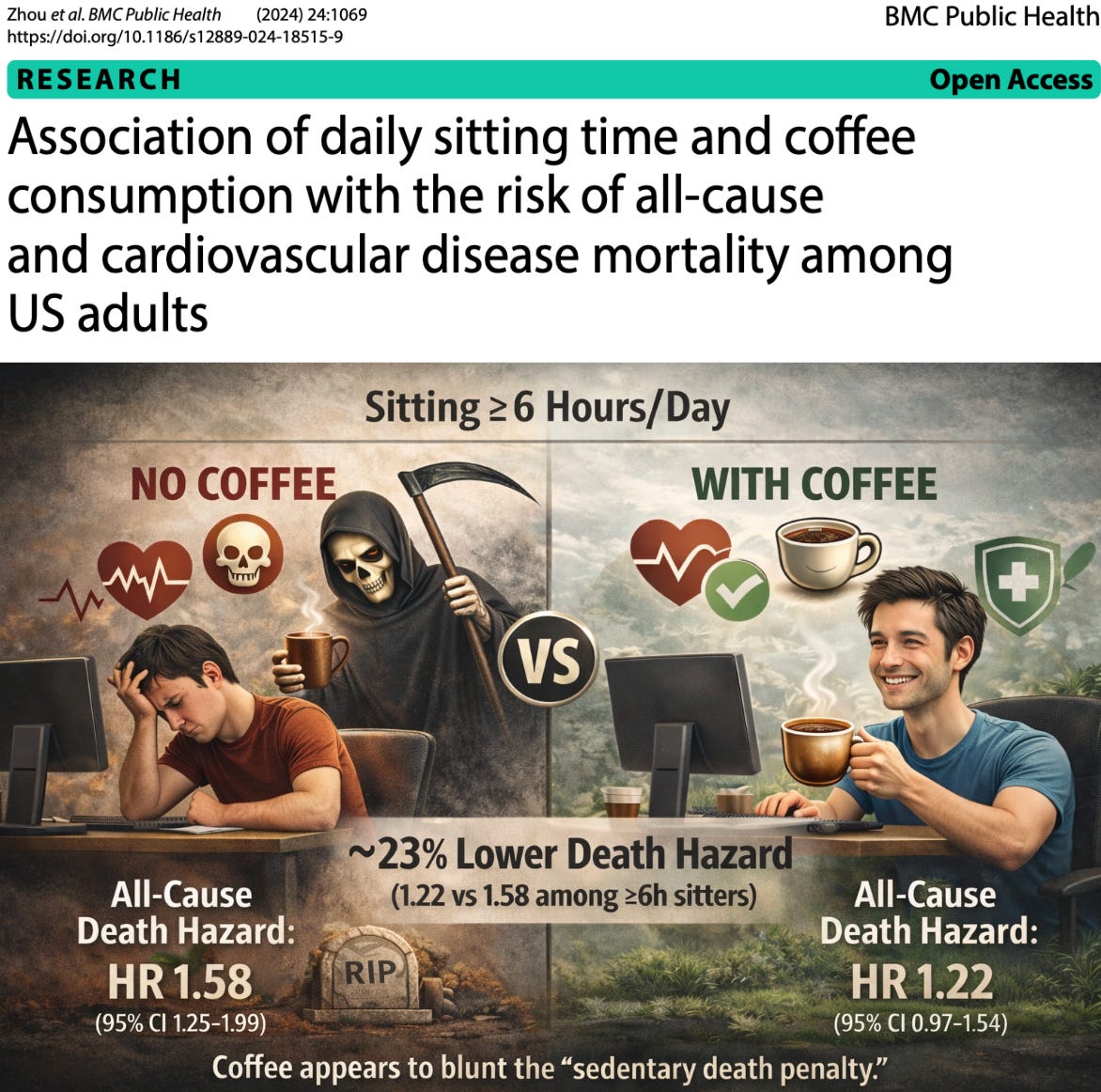 Dr. Peter McCullough MD - Jan 14th 2026 6:04pm EST by Nicolas Hulscher, MPH A recent National Health and Nutrition Examination Survey (NHANES) analysis suggests something surprising: coffee may “cancel out” the increased mortality risk seen in sedentary individuals that sit for long periods of time. Researchers analyzed 10,639 U.S. adults (NHANES 2007–2018) with mortality follow-up through Dec 31, 2019 (up to 13 years). During […]