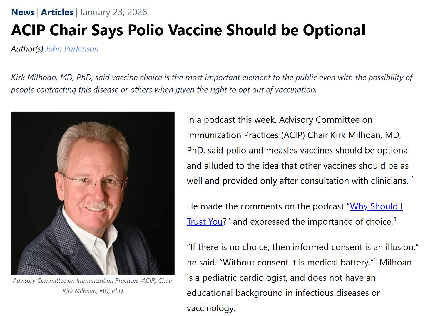 Dr. Peter McCullough MD - Jan 25th 2026 5:40am EST By Peter A. McCullough, MD, MPH NY Times bestselling author John Leake applied his scholarship to the history of polio, the hubris of vaccine development, and one of the greatest victories declared in public health. Recently, pediatrician and cardiologist Dr. Kirk Milhoan, Chairman of the CDC Advisory Committee on Immunization Practices said that even the […]