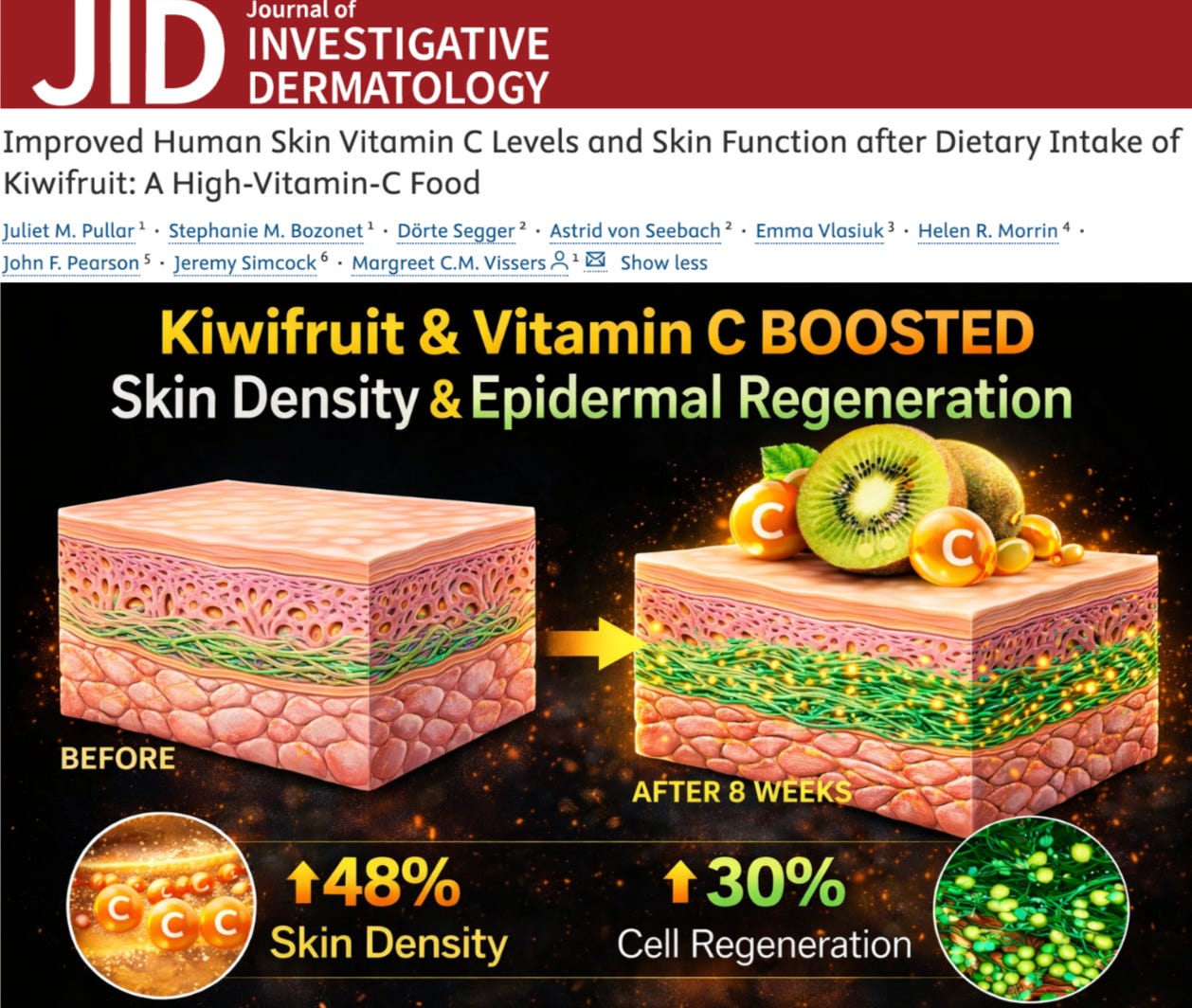 NEW STUDY: Eating Kiwifruit Increases Skin Density by 48% and Epidermal Regeneration by 30% via Raising Skin Vitamin C Levels