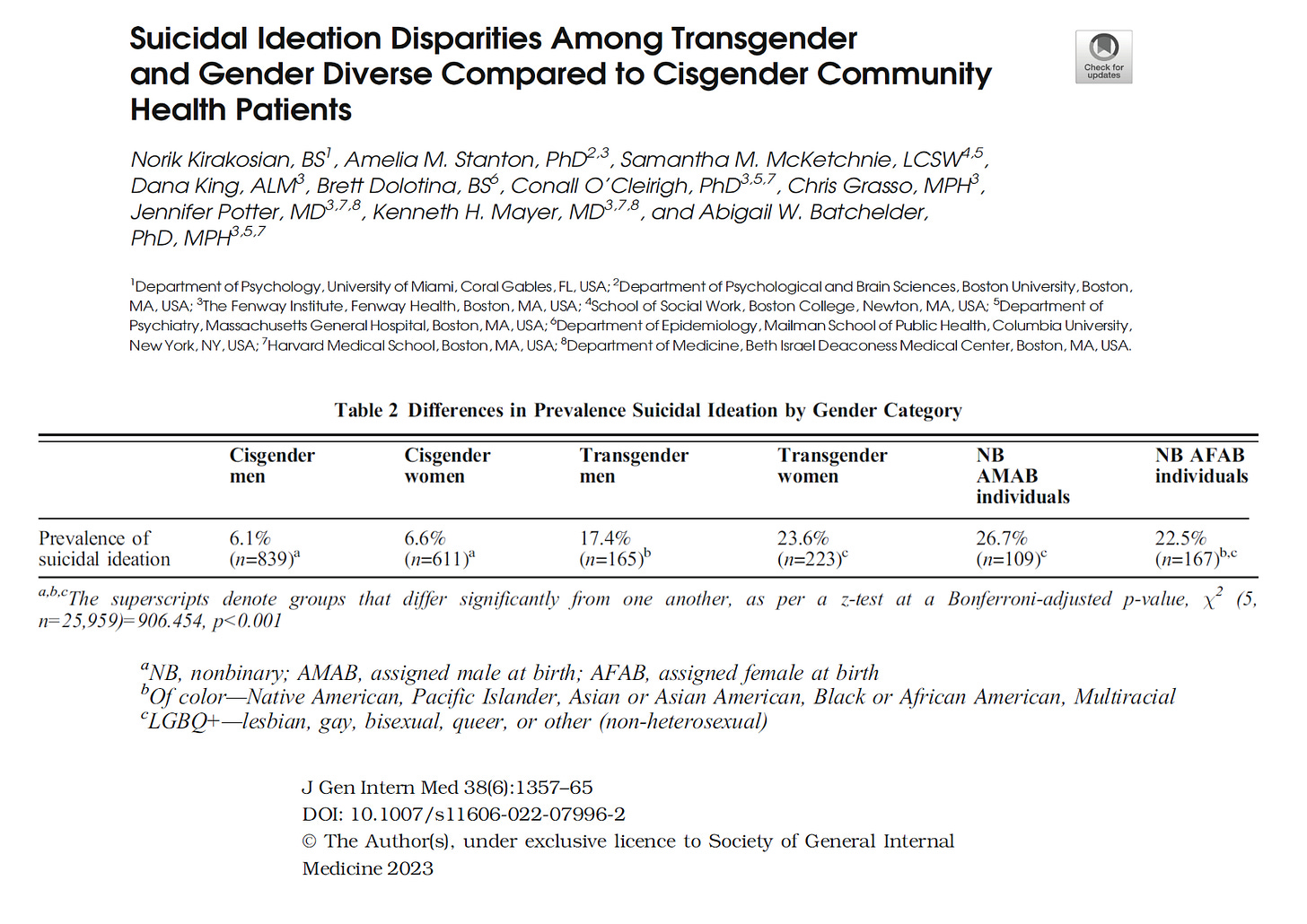 Suicidal Ideation Disparities Among Transgender and Gender Diverse Compared to Normal Gender Community Health Patients