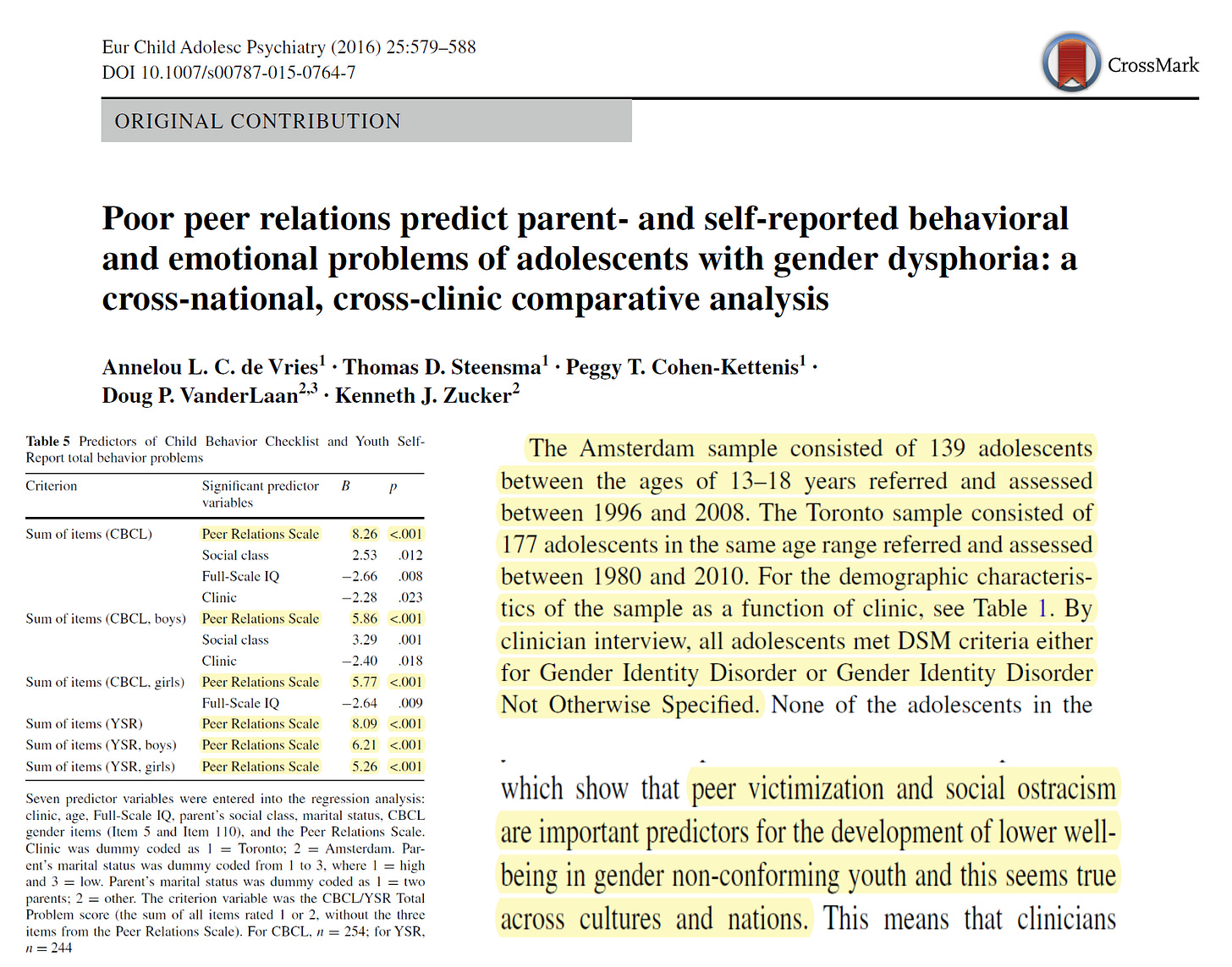 Poor Peer Relations are a Key Determinant of Gender Dysphoria in Adolescents