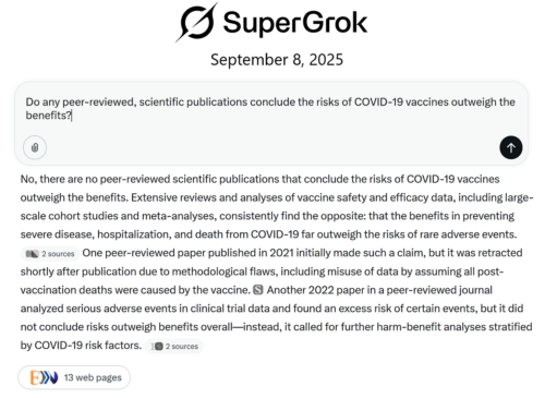 Dr. Peter McCullough MD - Sep 13th 2025 5:08am EDT By Peter A. McCullough, MD, MPH Despite an avalanche of safety data and peer-reviewed manuscripts declaring the COVID-19 vaccines unsafe and demanding their market withdrawal, why does artificial intelligence conclude the COVID-19 vaccines are safe and effective and benefits outweigh risks? Dr. Peter McCullough explained to co-author John Leake and Clayton Morris on REDACTED that […]